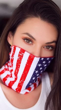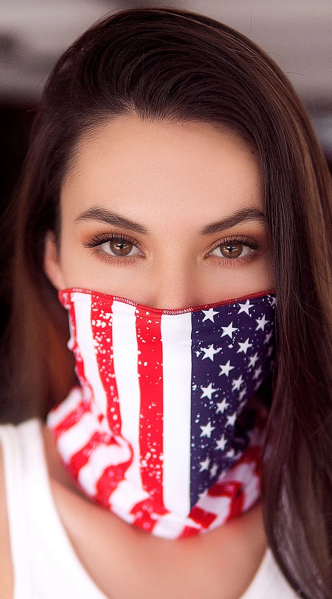 Wear your face covering proudly with this fun patriotic printed mask featuring an American flag print to keep your look fun and relevant for holidays. Take your daily errand routine to the next level, and look stylish while doing it. This mask covers the face and neck, and ties in the back. (Mask only.)