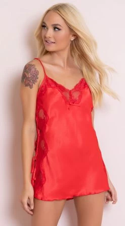 Surprise your sweetie with this elegant chemise featuring a soft scoop neckline with a sheer lace trim, adjustable spaghetti straps, a satin bow accent, a soft charmeuse bodice, open side panels with a sheer lace trim, and lace-up side ties.