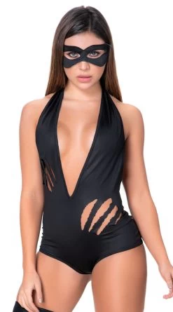 Are you feline destructive? Tease him with your talons in this Claws Out Cat lingerie costume featuring a black romper with a plunging V-neckline, halter ties, slashed cut-outs, a low open back, a cheeky cut bottom, and a matching cat mask. (Stockings not included.)