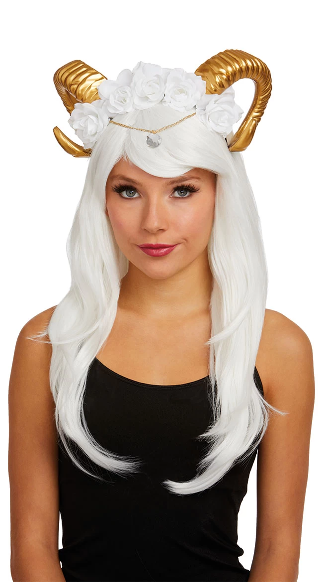 Top off your favorite mythical costume with this horn headpiece featuring white roses, gold horns, and a gold chain piece with gem accent. (Headpiece only.)