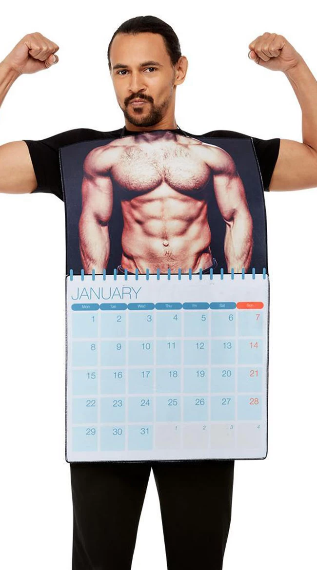 Hoping for those abs of steel after too many of grandma’s holiday meals? No need to trade dessert for dead lifts, you’ll look as fit as the male model on your calendar in this men’s Ripped Resolutions costume featuring a one piece fabric calendar page flipped to January with a muscular male photo, an elastic head loop, and a solid white backing. (Black shirt and pants not included.)