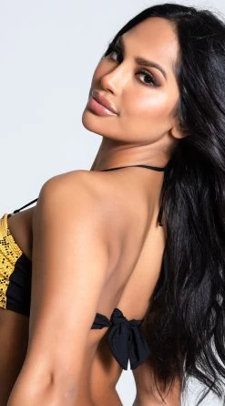 Be the center of attention in this sexy bikini featuring triangle cups, halter straps, a tie back closure, and matching bottoms with side tie closures and a cheeky cut back.