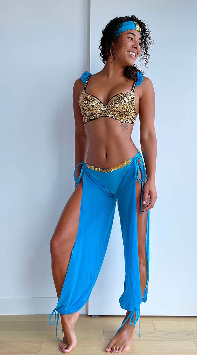 Enter a whole new world full of gypsies, royalty, and wonder! This Jazzy Jezebel costume features a demi cup bra top with adjustable straps, a gold sequin overlay, and turquoise fabric accents, matching harem bottoms with a turquoise bikini, gold sequin detailing, adjustable tie sides and ankles, and sheer inner leg draping, and a headband with sequin detail.