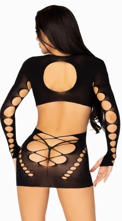 Look hot from every angle in this sultry mini dress featuring a high neckline, a wide net bodice with small keyhole cut-out accents, long sleeves with cut-out panels, a large back cut-out, an open back panel, a form-fitting skirt with keyhole cut-outs, and a faux lace-up back detail.