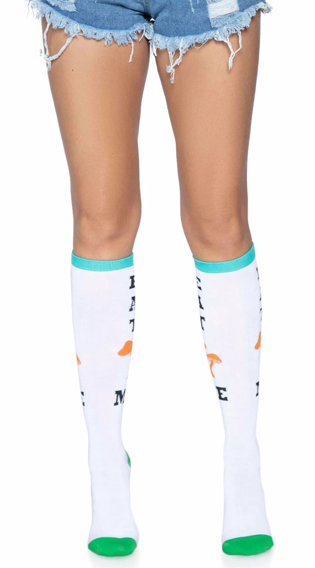 Finish off your delectable look with these white knee high socks featuring a blue trim, “EAT ME” printed in black along the sides with an orange mushroom decal, and a blue tipped toe and heel. (Shorts not included.)