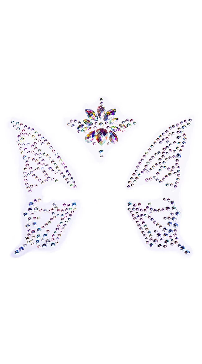 Complete your mythical look with these silver adhesive face jewels featuring silver butterfly wing stickers and a multi-sized jeweled forehead sticker.