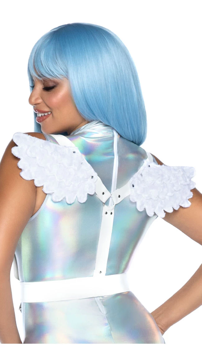 You’re for sure going to Heaven in this stunning angel wing harness featuring two adjustable shoulder straps, an adjustable waist strap, silver studded details with O-ring accents, and petite angel wings with furry accents. (Bodysuit and wig not included.)