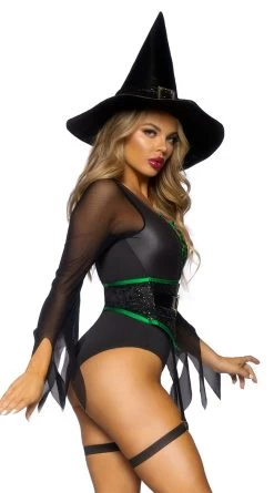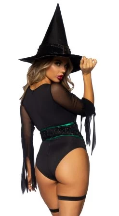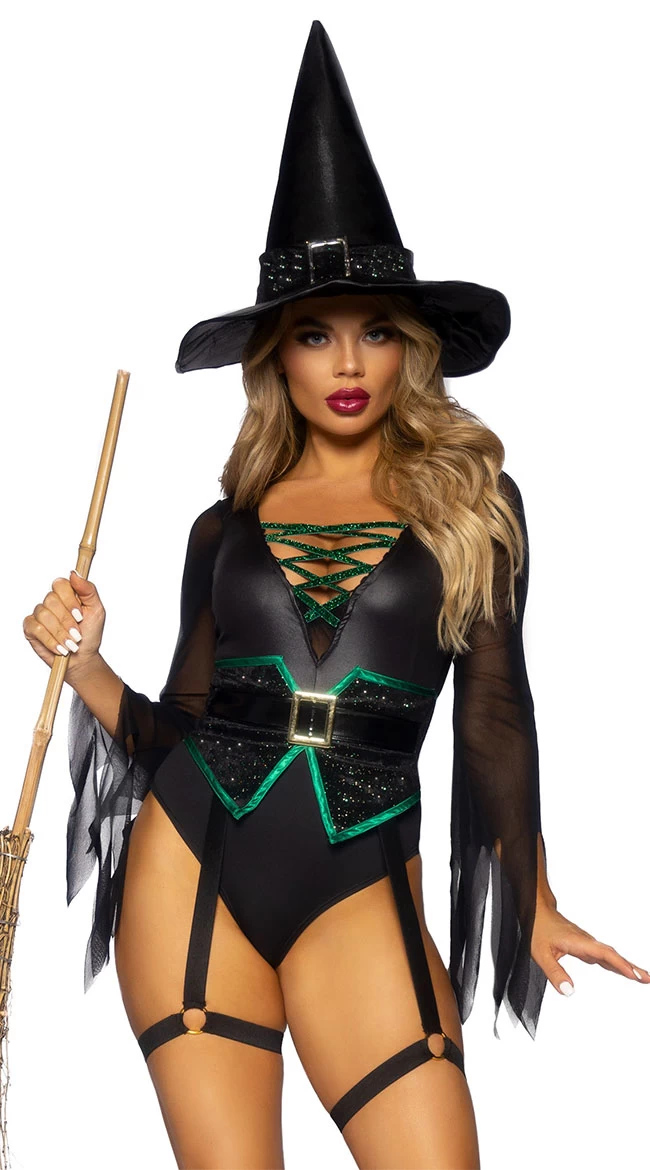 Cast a bewitching spell in this Green Queen witch costume featuring a black bodysuit with a deep V-neckline, glittering green lace-up detailing, sheer mesh sleeves with shredded accents, a back zipper closure, a cheeky cut back, an attached glittering black waist cincher with a green trim, a black belt with gold buckle, attached garters with wraparound leg garters, and a matching witch hat. (Broom not included.)