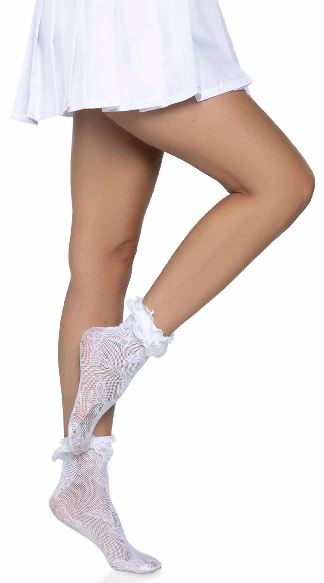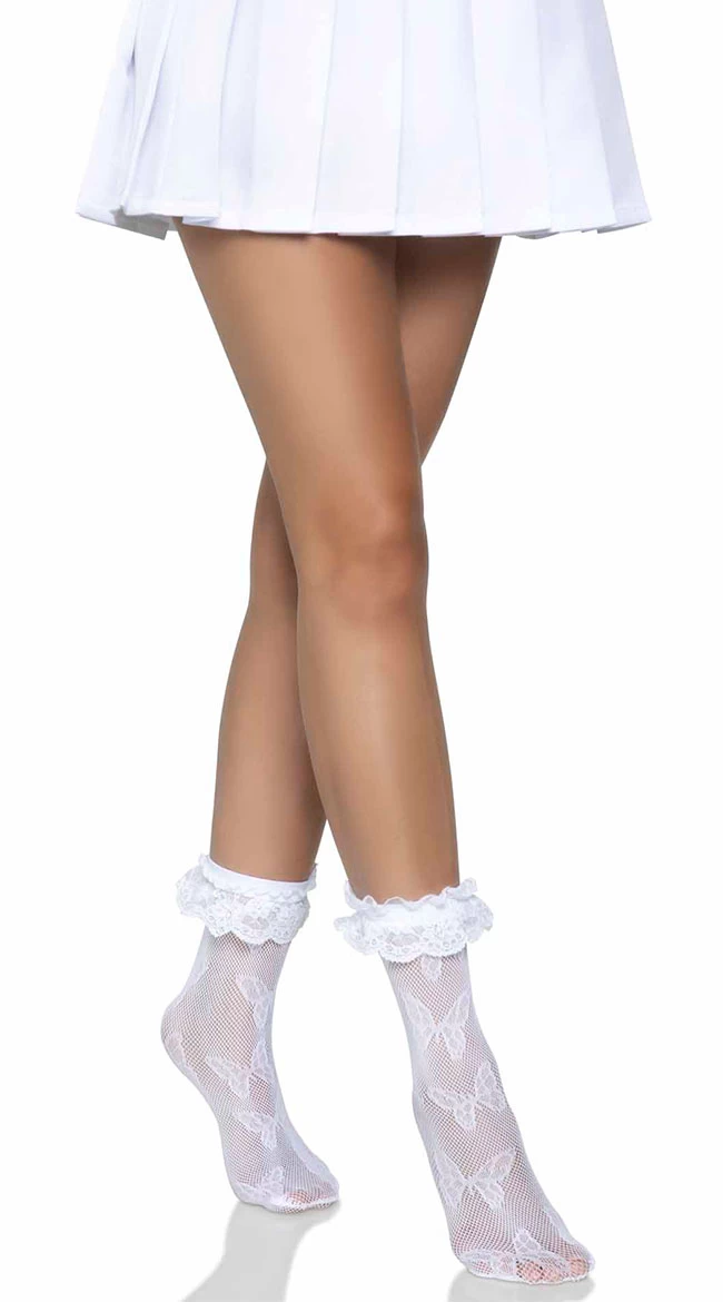 Add a flirty touch to your outfit with these fishnet ankle socks featuring an allover butterfly design and a ruffled lace trim. (Skirt not included.)