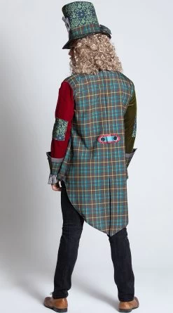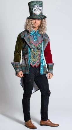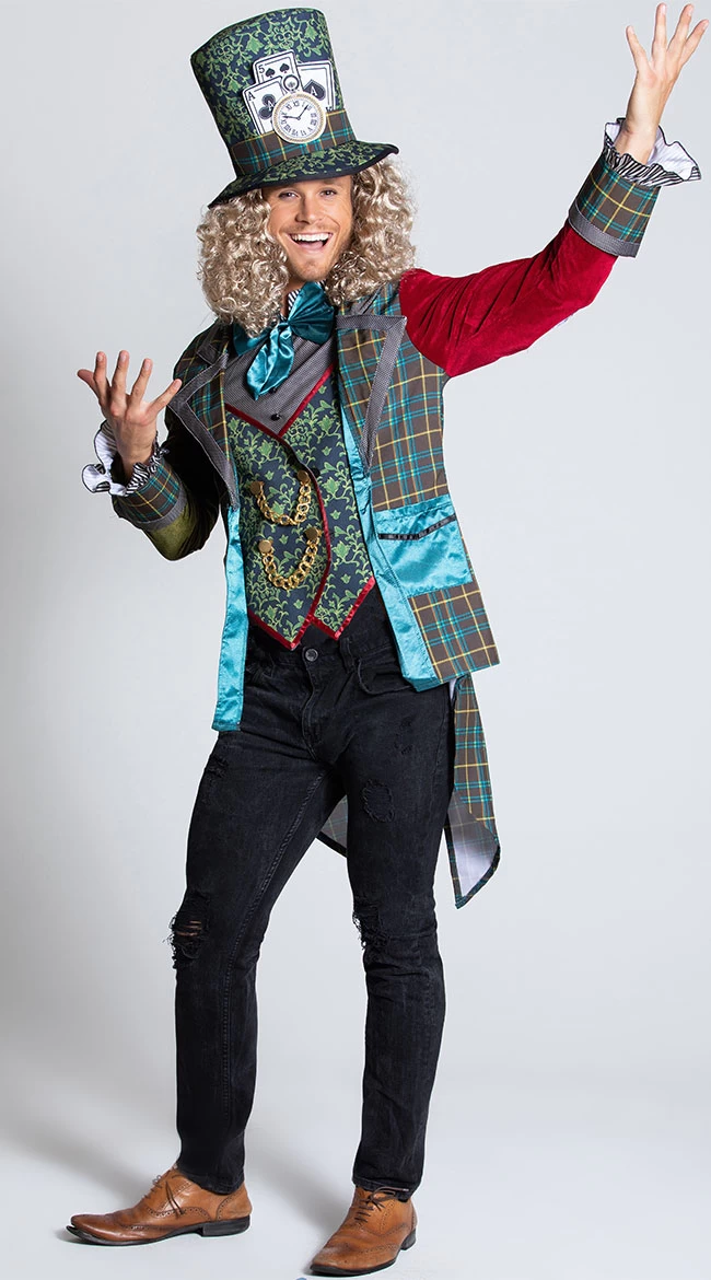 Be the master of your very own insane party in this Men’s Deluxe Mad Hatter costume featuring a jacket styled shirt with a blue plaid torso, one green velvet sleeve, one red velvet sleeve, blue plaid cuffs with grey linings, a black and white ruffled trim, a black and white stripped pocket, a blue with black trim pocket, a dark grey undershirt detailing with a black and white striped collar, a turquoise satin bow, black buttons, a green brocade vest with a red trim, gold chain detailing, and a matching green brocade top hat with blue plaid ribbon, clock decal, and card accents. (Cup, Wig, and Pants not included).