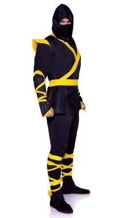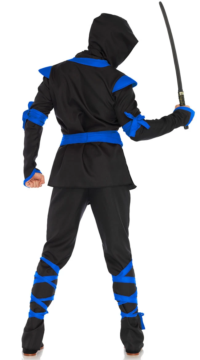 Sneak in for the kill in this men’s Hidden Warrior costume featuring a black long sleeve shirt with a detachable hood, attached wraps, matching pants, and a black face mask. (Shoes and sword not included.)