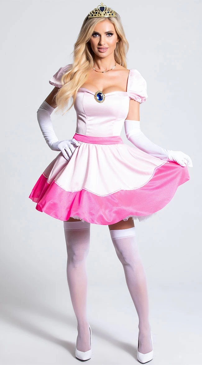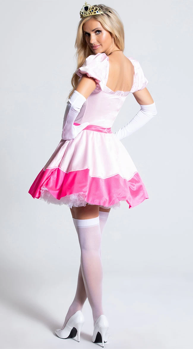 Be peachy keen and ready for rescue in this cute Pink Princess Costume featuring a flouncy pink jeweled dress, a matching crown, and long gloves. (Petticoat, stockings, and shoes not included.)