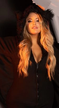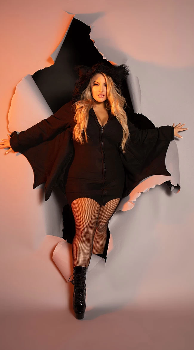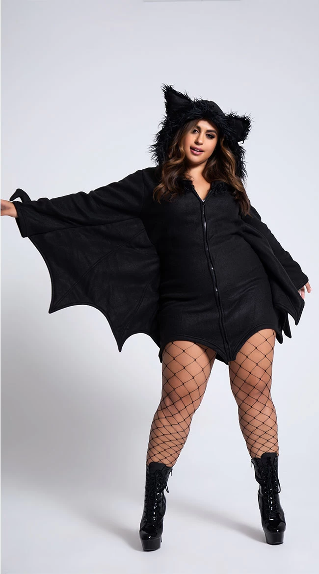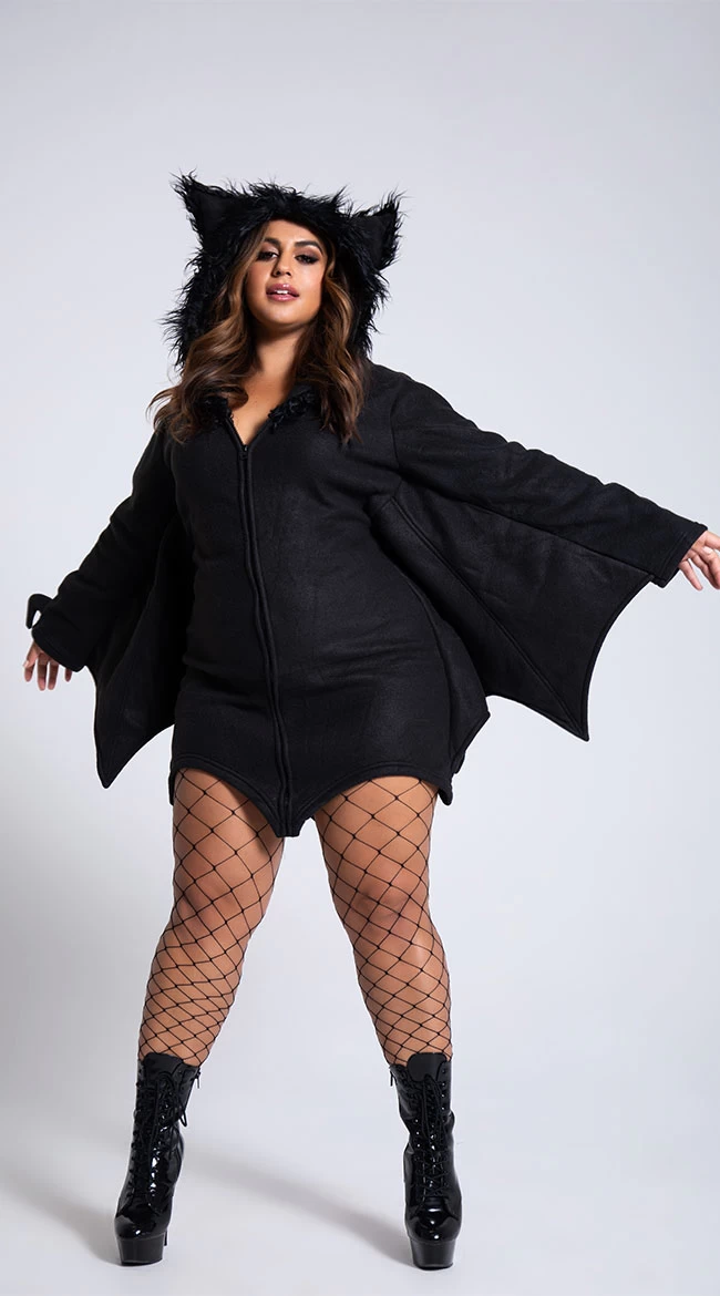 Soar through the night in comfort in this plus size Fleece Bat costume featuring a black fleece dress with zip up front, attached bat wing sleeves, jagged hemline and attached hood with faux fur trim and ears. (Leggings not included.)