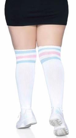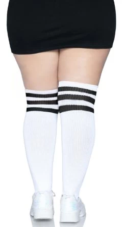Finish off your sexy look with these plus size athletic socks featuring an over the knee length and triple striped tops. (Skirt not included.)