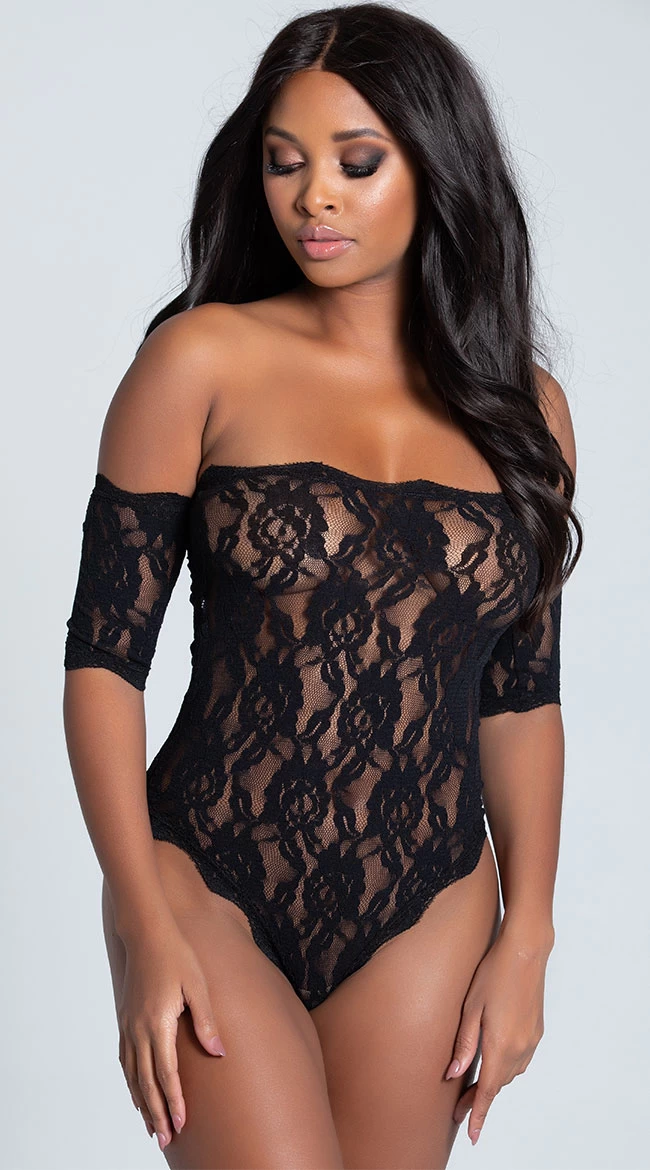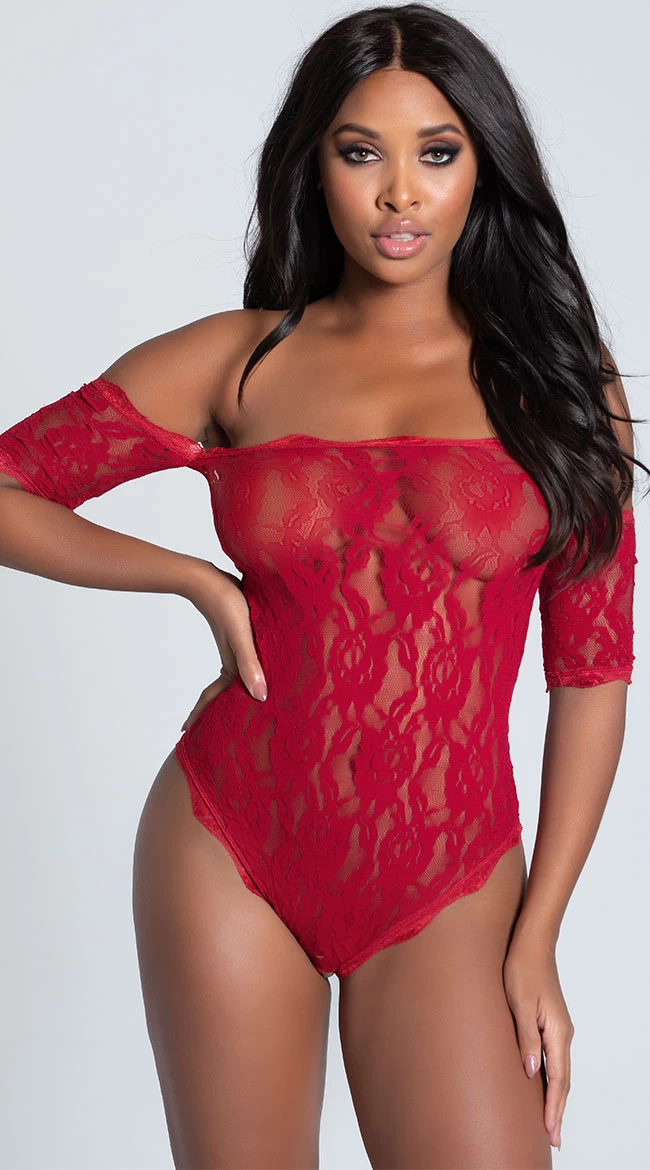 Feel like a beautiful seductress in this sexy teddy featuring sheer lace cups, an off-the-shoulder neckline with short sleeves, a sheer lace bodice, a scalloped trim, and a cheeky cut back.