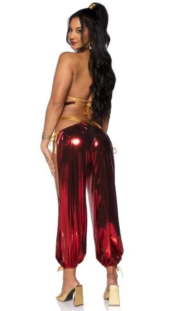 Serve up some royal attitude on this Ruby Desert Princess costume featuring an iridescent red bikini top with gold halter straps, a strappy underbust with a tie back closure, and matching harem pants with side tie closures, open legs, and cuff tie closures,