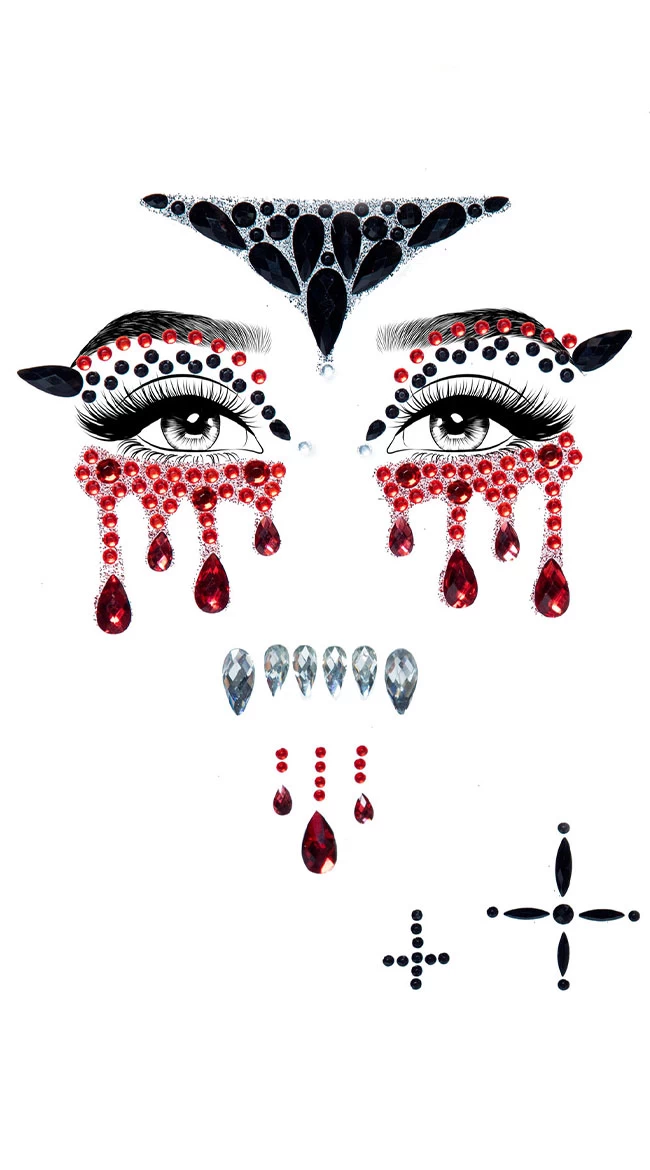 Beautify your vamp with these stunning face jewels featuring eye-framing red gems with glimmering tear accents, clear lip gems, a V-shaped forehead detail, and two cross jewels. Jewels feature an adhesive backing for easy removal.