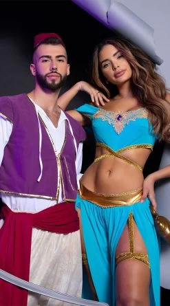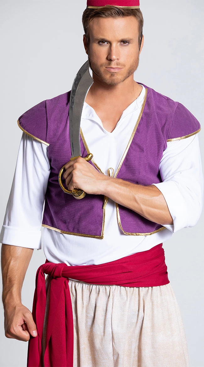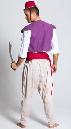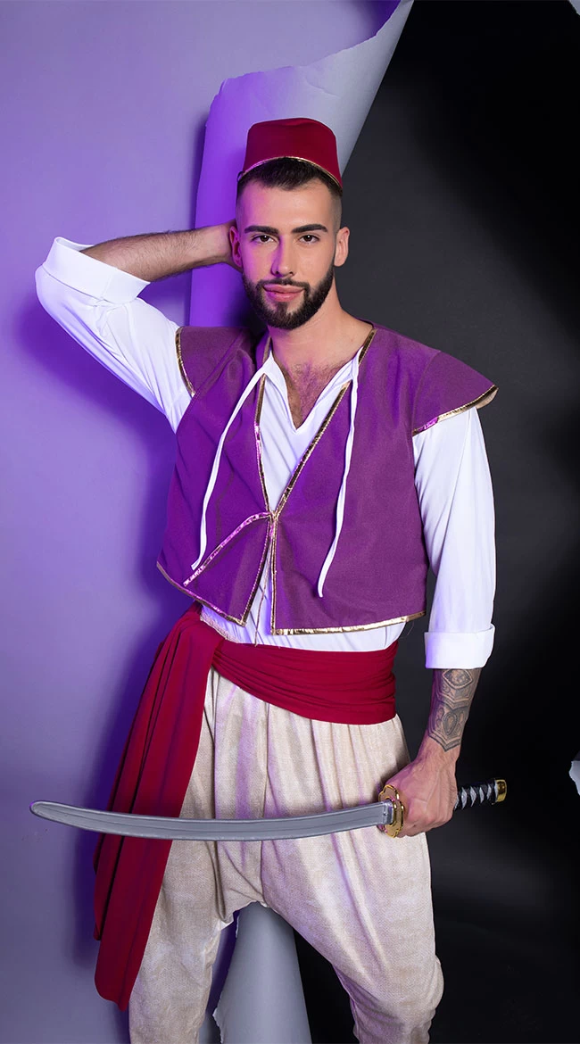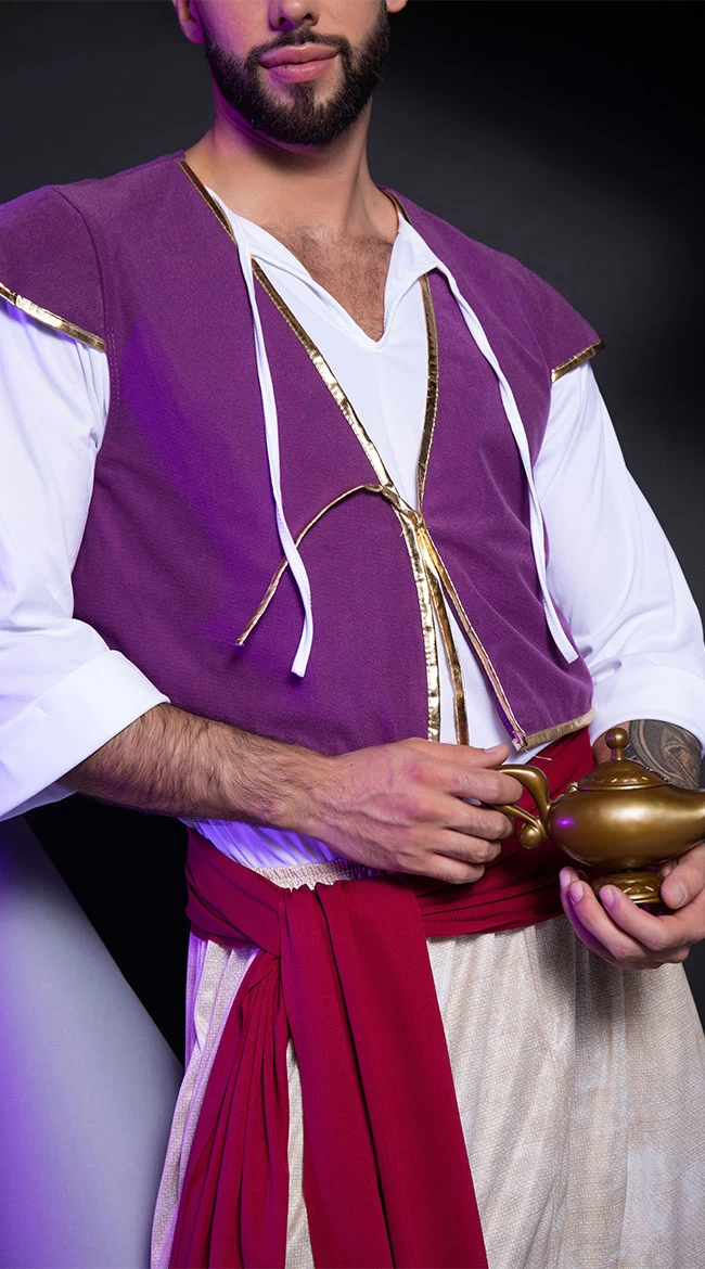 The world is yours to explore! Take a seat on a magic carpet and soar through the sky in this men’s Arabian Folk Hero costume featuring a white tunic shirt, a cropped purple vest with gold trim, a red waist sash, harem pants, and a hat. (Sword, lamp, and sandals not included.)