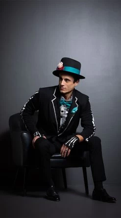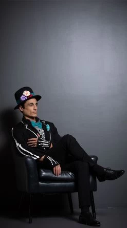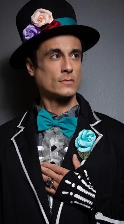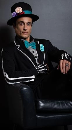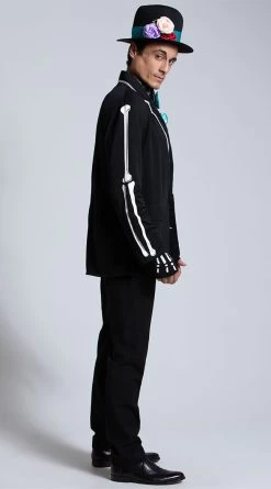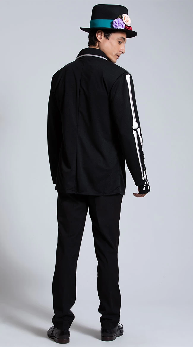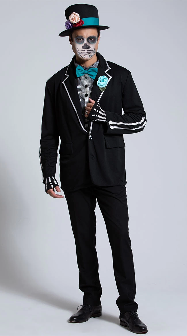 Come back to life in this Men’s El Novio Muerto costume featuring a skeleton printed jacket, top hat, sleeveless shirt with attached bow tie, boutonniere and two tattoo makeup sheets. (Pants not included.)