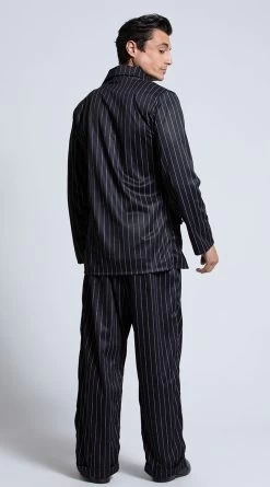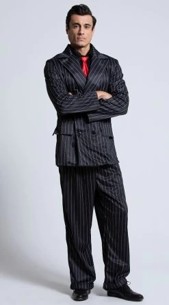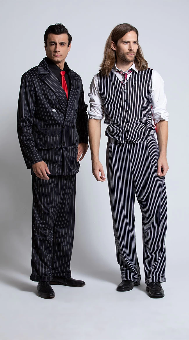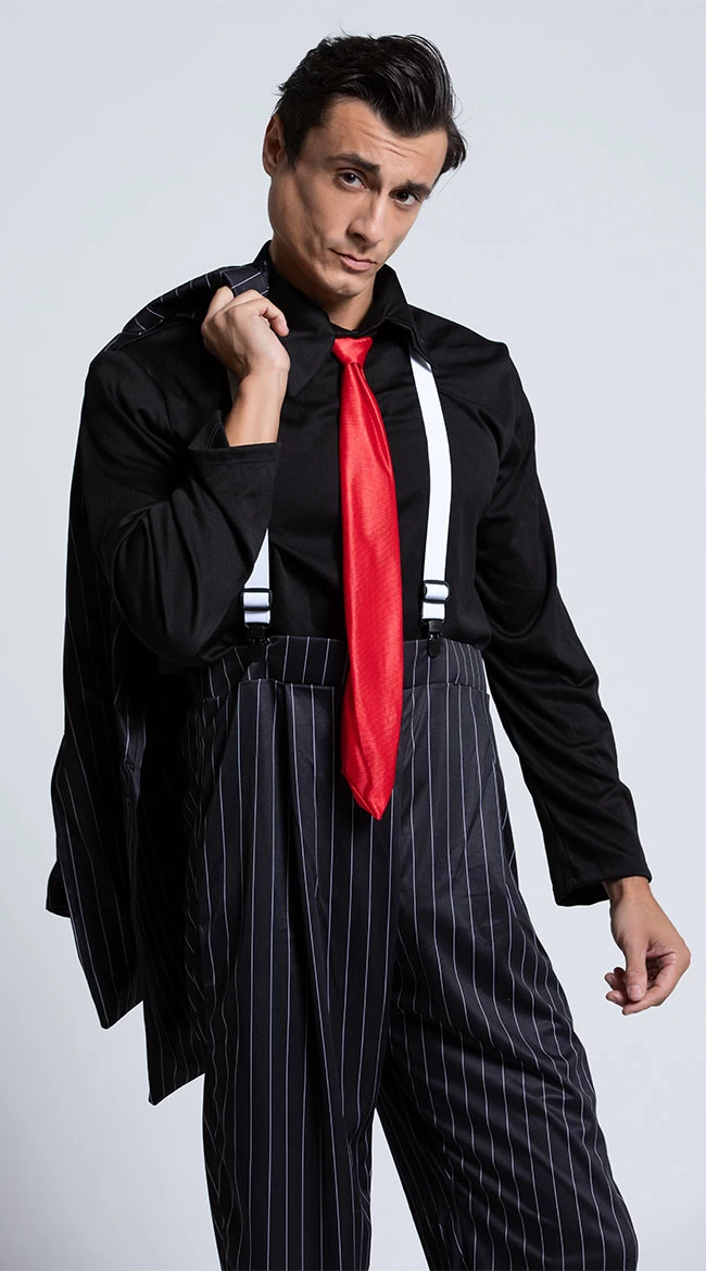 The Men’s Mob Boss costume includes a black pinstripe jacket, matching pinstripe pants, shirt, red satin tie and res suspenders. (Hat and toy gun not included.)