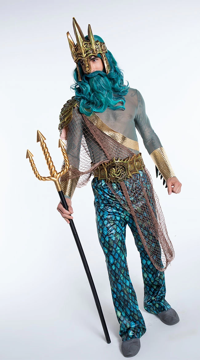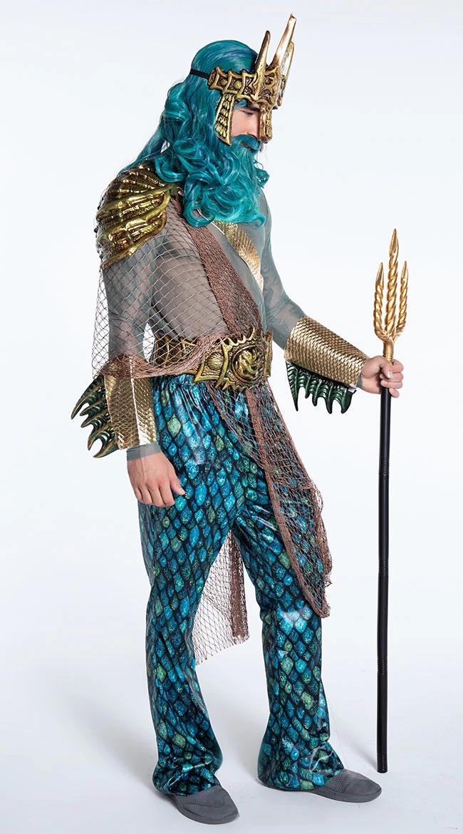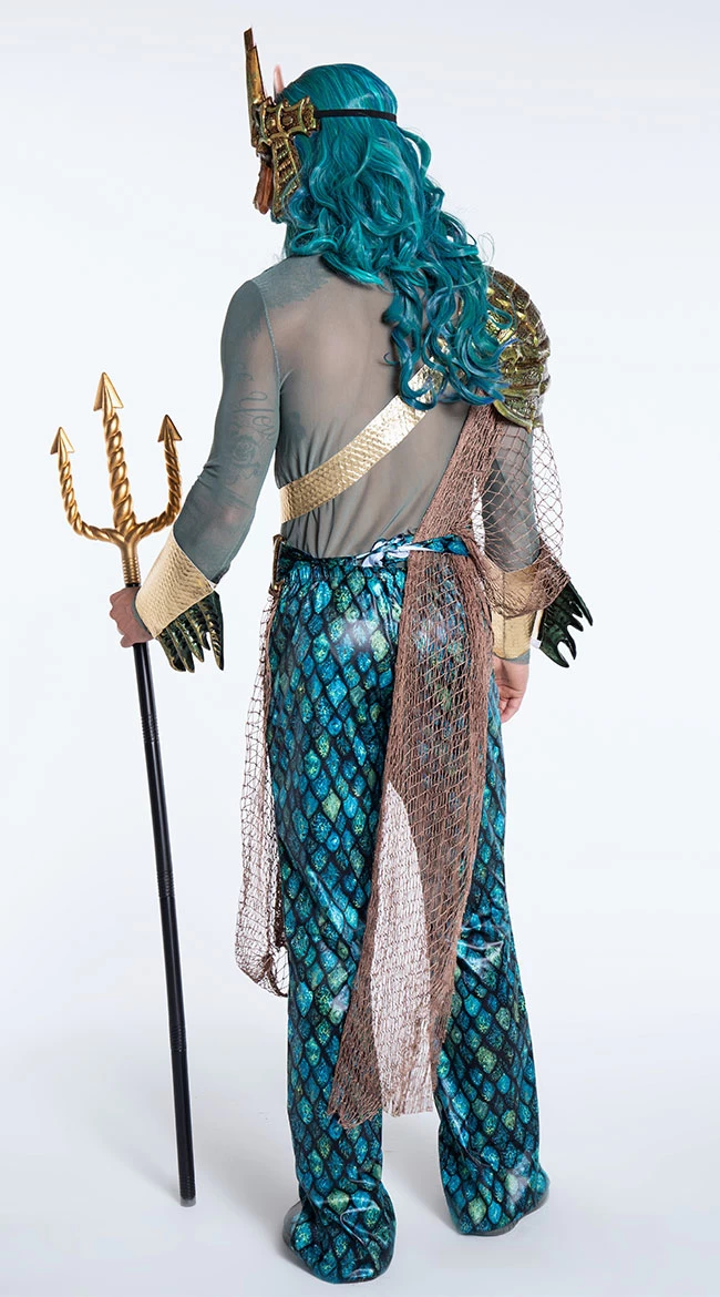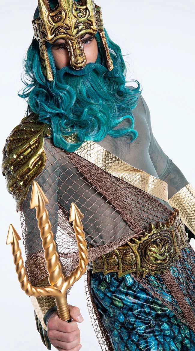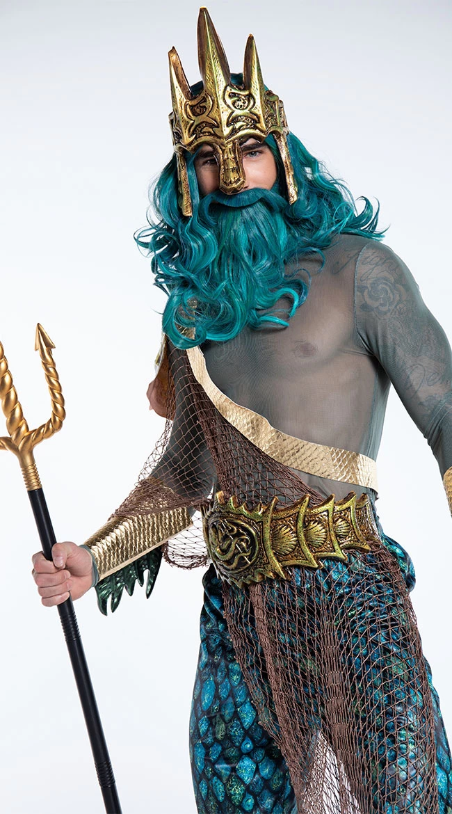 Command the mythical seas with a vengeance! Make waves in this men’s Now You Sea Me costume featuring a grey undershirt with cross body gold armor detailing, fish fin arm bands, draping net panels, a gold waist belt, blue scale print pants, and a matching crown headpiece. (Wig, beard, pitch fork, and sandals not included.)