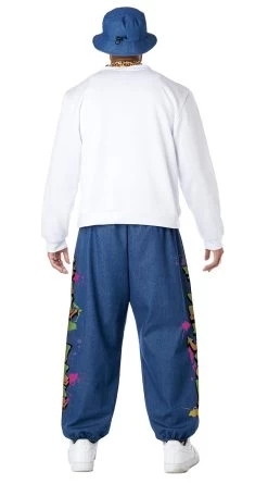 Grab a boom box and your shorty! Win the next rap battle in this men’s Old School Rapper costume featuring a white long sleeve sweatshirt with an “Old School” graphic detail, blue pants with elasticized cuffs, and a “Fresh And Fly” screen print on the legs, and a matching bucket hat. (Jewelry and shoes not included.)