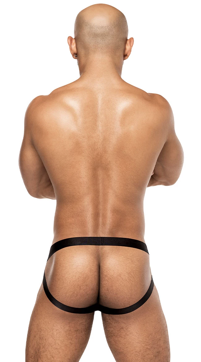 Tempt and tease in this men’s jockstrap featuring a black waistband, an iridescent purple front pouch, “MP” embroidered in white, and an open back with booty framing straps.