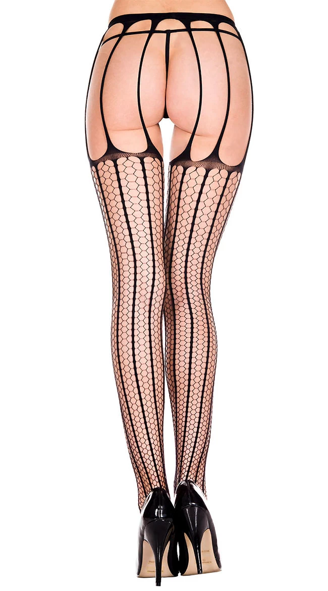 Heat up your evening in these sexy pantyhose featuring a mid waistband with multiple slashed attached garter straps, an all over hexagon fishnet with vertical stripes, and an over the toe style. (Panty not included.)