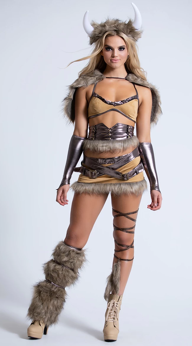 Discover new lands in this Modern Day Viking costume featuring a suede bra top with a ruffled silver trim, halter straps, faux fur shoulder pads with neck tie closure, a silver waist cincher with gold accents, a fur trim, a matching suede skirt with a ruffled silver trim, a matching belt with gold buckles, silver arm gauntlets, a fur trimmed headband with horn accents, a furry leg warmer with strappy detailing, and a strappy leg wrap with a fur trimmed tassel. (Sword not included.)