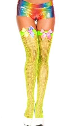 MUSIC LEGS Neon Fishnet Stockings With Rainbow Satin Bows
