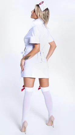 Who wants a checkup? Send their blood pressure rising in this Naughty Night Shift Nurse costume featuring a white collared wrap dress with adjustable ties, a deep V-neckline, an apron with a medic logo, a matching hat, and a stethoscope. (Shoes and stockings not included.)