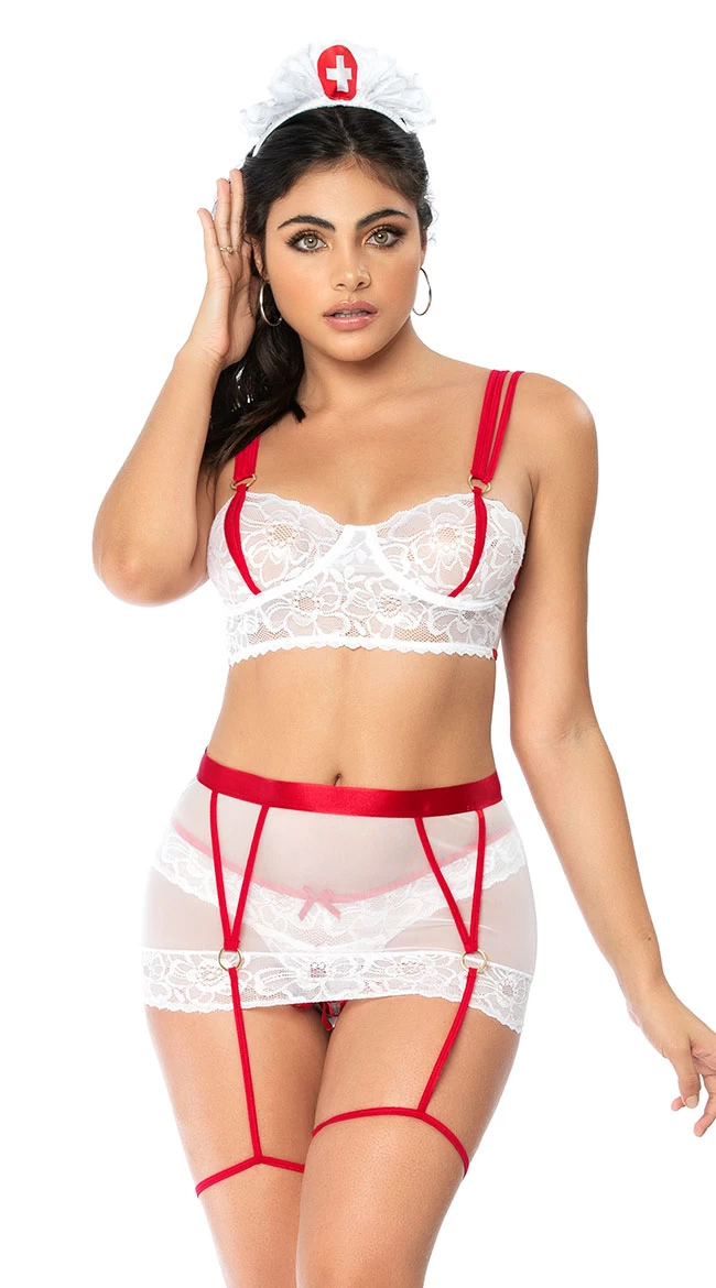 Get hearts pounding in this Naughty Nurse lingerie costume featuring a white lace bra with sheer underwire cups, red piping details, multiple red spaghetti straps with O-ring accents, a white lace underbust band, a red trimmed back band with a hook and eye closure, a matching sheer mesh skirt with a lace trim, a red waistband with a satin tie back closure, red strappy garter straps with O-ring accents, attached leg garters, a matching lace panty with red bow accents, an open crotch, a thong cut back with a keyhole opening, and a matching nurse headband.