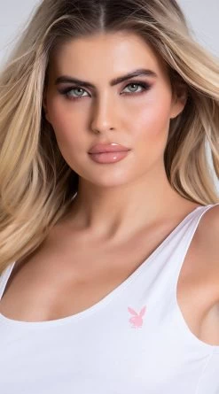 Have sexy daydreams in this pink and white Playboy Exclusive lounge short set featuring a scoop neck tank top with a pink bunny logo, a cropped length, and matching shorts with a high drawstring elastic waistband, and a flirty repeating white bunny logo print.