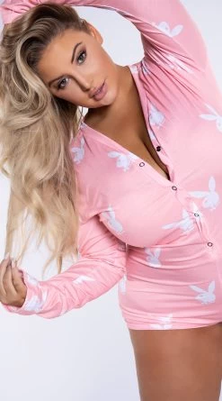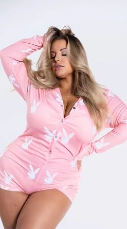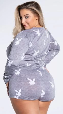 What’s an eventful evening without a little play? Sprawl out over the duvet and dare to be desired in this plus size Playboy Exclusive sophisticated lounge romper featuring an all over rabbit head logo print, snap button front closures, long fitted sleeves, and a mini length.