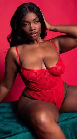 Whisper naughty thoughts into your babe’s ear in this gorgeous Playboy Exclusive plus size teddy featuring sheer underwire cups with a flocked Rabbit Head design, a stunning satin trim, adjustable spaghetti straps, a sheer mesh bodice with a satin waistband, flattering high cut sides, and a thong cut back.