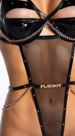Crave your lovers touch in this stunning Playboy Exclusive teddy featuring wet look underwire peek-a-boo cups with strappy detailing, metal stud accents, adjustable spaghetti straps, a cage style back band with a hook and eye closure, chain, links, a slim mesh bodice, a waistband with Playboy nameplate, and a g-string cut back.