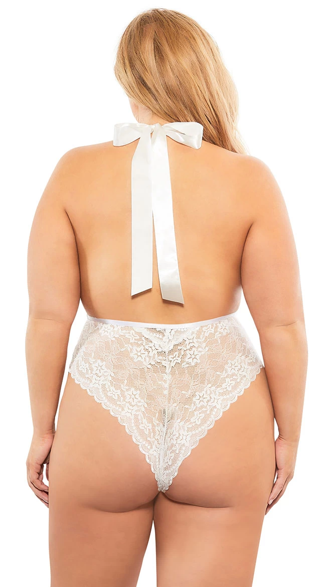 Bump up the sex appeal in this alluring plus size teddy featuring sheer mesh cups with delicate gathered fabric, satin halter straps, a sheer lace bottom, high cut scalloped sides, and a sheer lace, cheeky cut back.