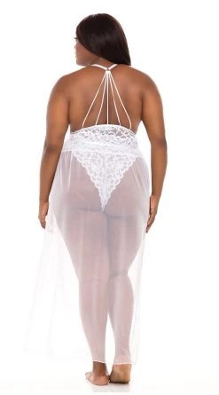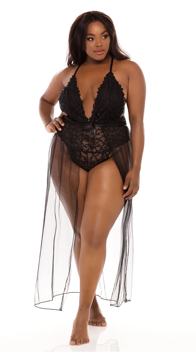 Yearn for your babe’s affection in this stunning plus size mesh skirt featuring a satin waistband with a tie front closure, an all over mesh, and a tea length. (Bodysuit not included.)