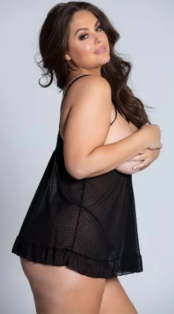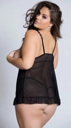 Stay up all night in this plus size sheer babydoll with adjustable double spaghetti straps, satin bow accents, open cups, an allover polka dot pattern, and matching panty.