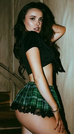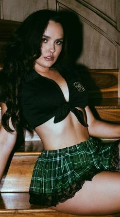 Get extra credit in this Prep School Girl lingerie costume featuring a black tie front crop top and green plaid mini skirt with pleats and black lace trim.