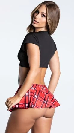 Earn extra credit in this Preppy School Girl lingerie costume featuring a lycra crop top with cap sleeves, a front tie closure, and a plaid micro mini skirt with an elastic waistband and a fluttered hem. (Thigh high stockings not included.)