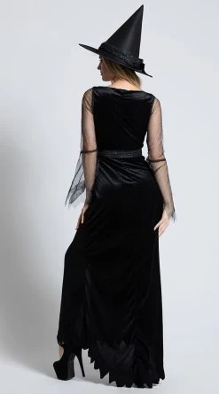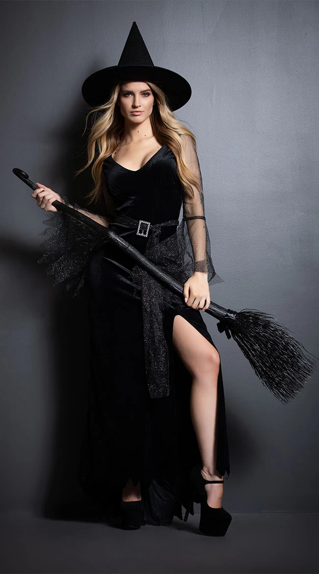 Become the silhouette in the moon in this Rich Witch costume featuring a floor length velvet dress with a scooped V-neckline, long mesh sleeves with jagged bell cuffs, a form fitting bodice, slightly flared skirt with a jagged trim, a high leg slit, a metallic black sash with silver buckle, and a matching witch hat with metallic sash and silver buckle. (Broom not included).