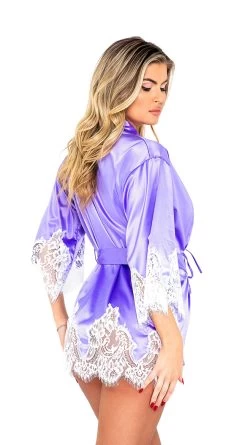 Snuggle up to your sweetheart in this dreamy robe featuring an all over satin finish, 3/4 length kimono sleeves with lace detailing, a satin waist belt with a tie front, and a mini length with an eyelash lace hem. (Robe only.)