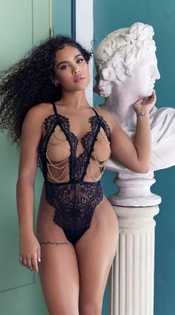 Show off your sexiest assets in this eyelash lace teddy featuring a deep V-neckline, adjustable criss-cross spaghetti straps, open cups with draping gold chain accents, a low open back, a high cut leg, and a thong cut back.