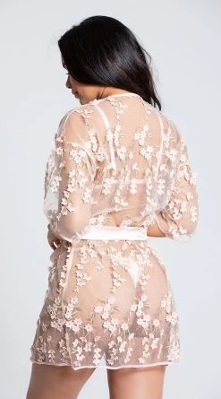 Lounge in pretty relaxing style in this sexy lace robe featuring a sheer mesh with pale pink hued floral appliques, loose kimono elbow length sleeves, a satin waist belt with a tie front closure, and a knee length. (Robe only.)