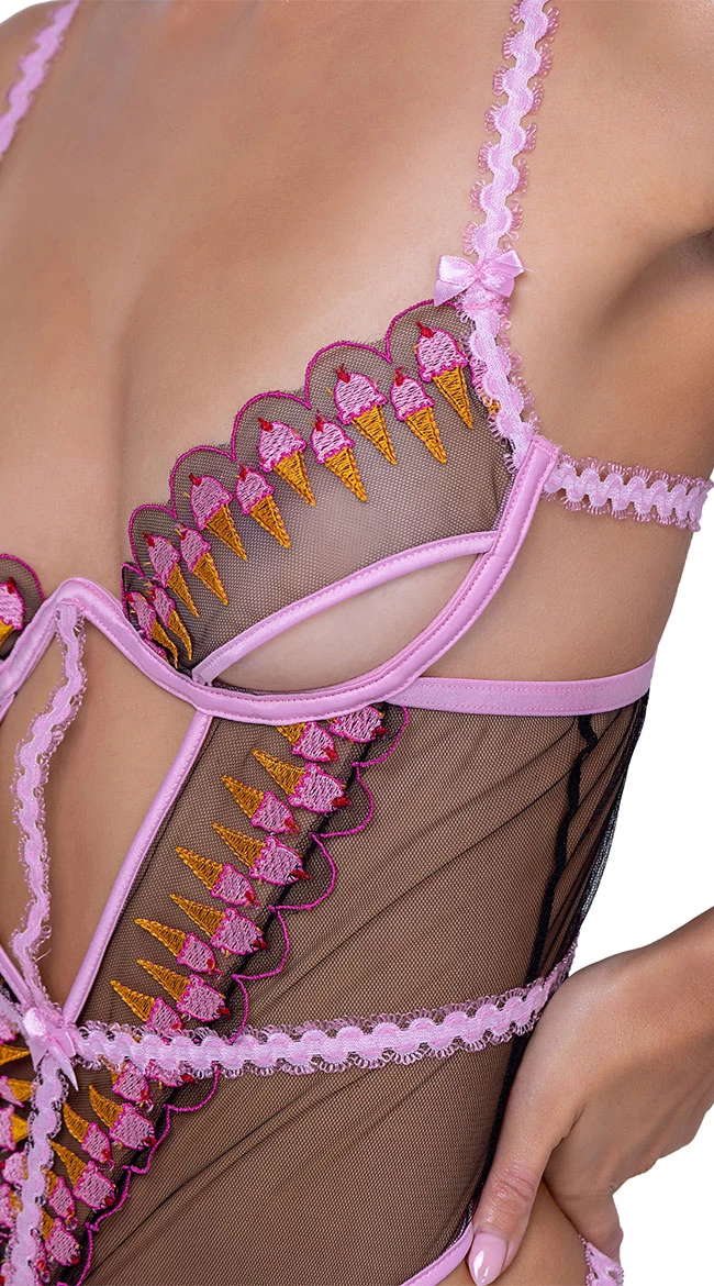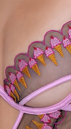Look good enough to eat in this sweet and sexy teddy featuring sheer mesh underwire cups with a scalloped trim, peekaboo open panels, strawberry ice cream embroidery, adjustable scalloped spaghetti straps, a sheer mesh bodice with a cut-out panel, scalloped pink piping details, ice cream embroidery, a low scoop back with a hook and eye back closure, satin bow accents, a high cut leg with strappy detailing, and a thong cut back. (Sunglasses and ice cream not included.)
