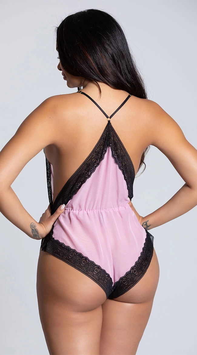 Snuggle up with your sweetie in this sexy chiffon romper featuring a V-neckline, adjustable spaghetti straps, a black scalloped lace trim, a sheer wrap bodice, a gathered waistband, high cut sides, a racerback, and a soft cheeky cut back.