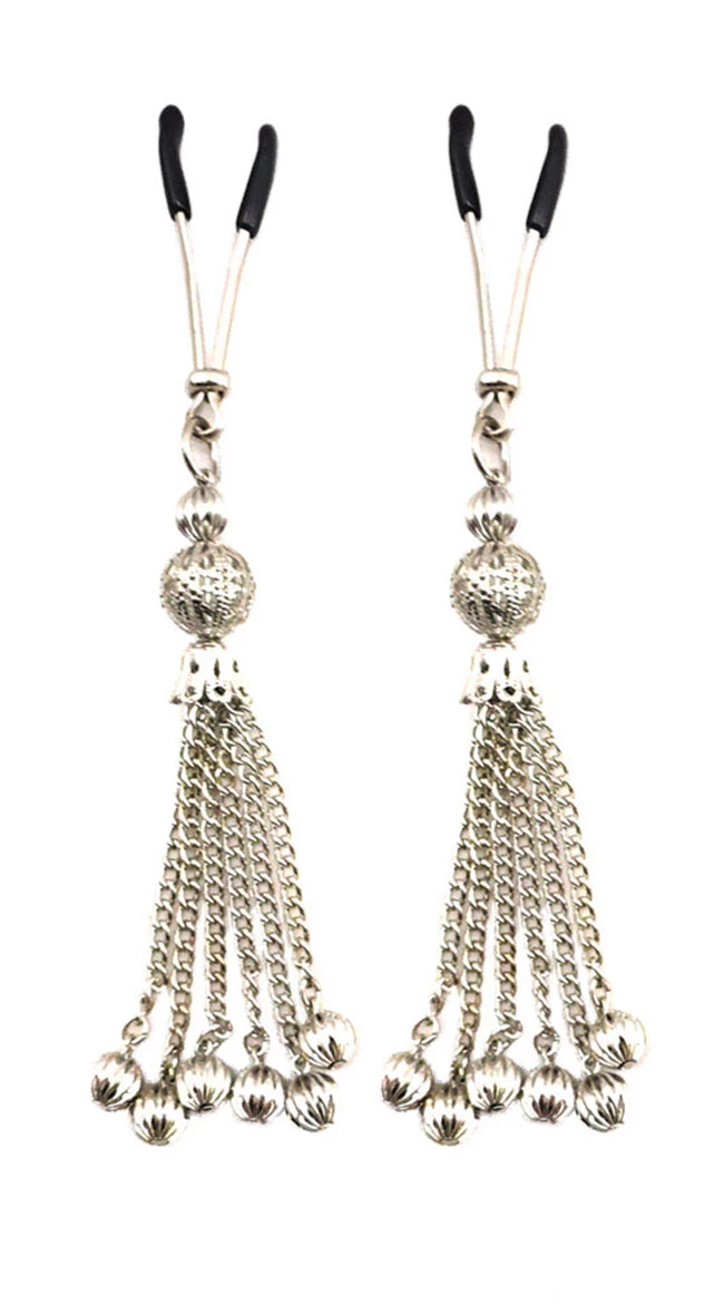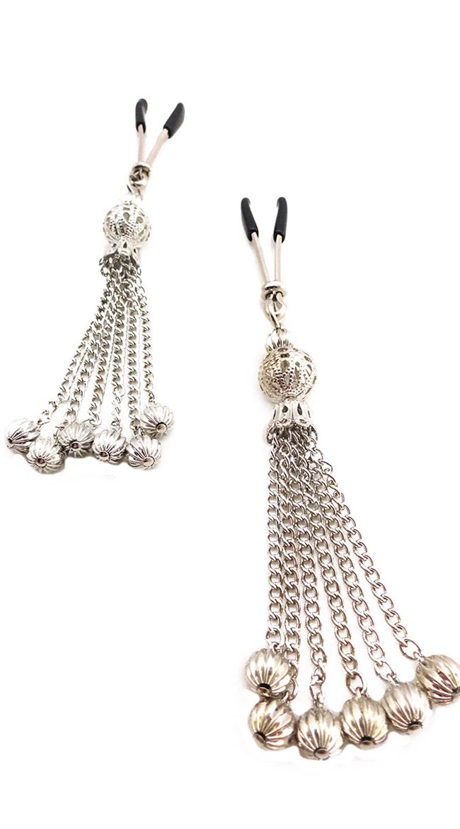 Ignite your passion with these sexy nipple clamps featuring silver link chain tassels with silver ball accents, and silver clamps with black rubber padding for a comfortable fit.