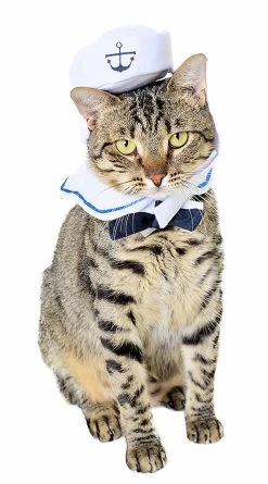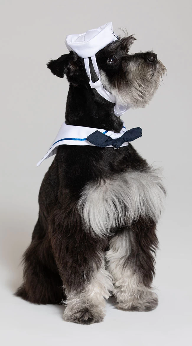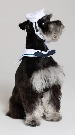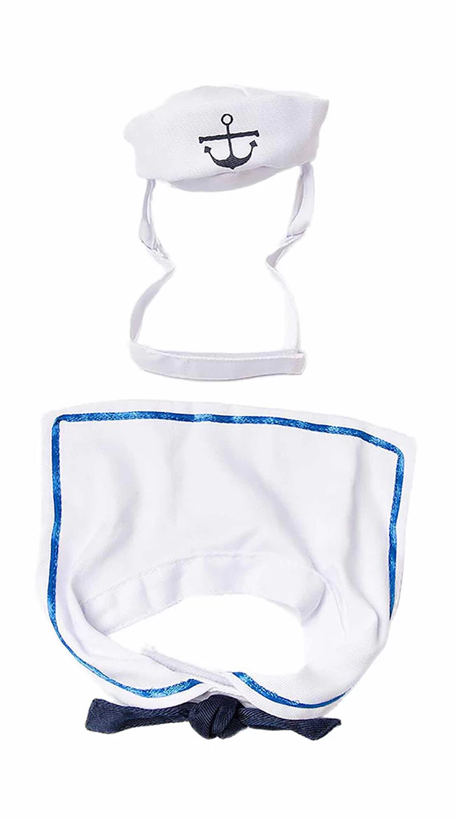 Dress up your First Mate and set sail on your next adventure together! This Small Pet Sailor costume features an adjustable hook and loop closure sailor hat and a no-slip ascot that fits most animals up to 15 lbs and dogs with necks of 8″-13.5″.