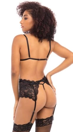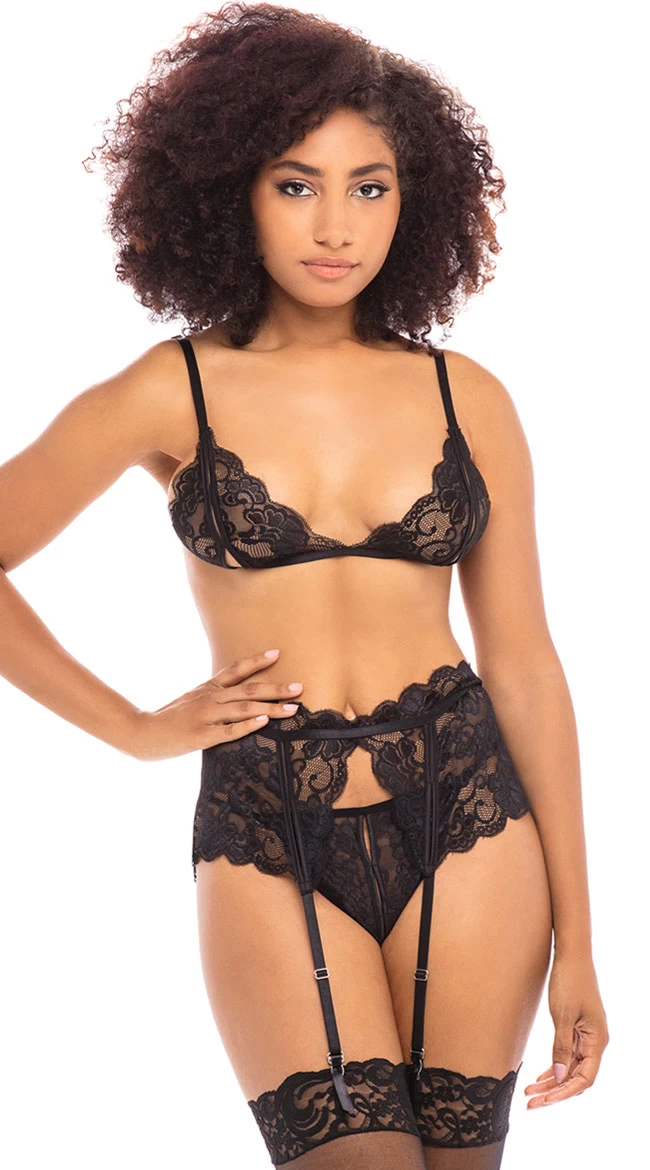Play peek-a-boo in this stunning bra set featuring sheer lace triangle cups with a split open trim, adjustable spaghetti straps, a hook back closure, a matching high waisted lace garter belt with adjustable garter straps, a V-shaped front and back, and a matching peek-a-boo g-string. (Stockings not included.)